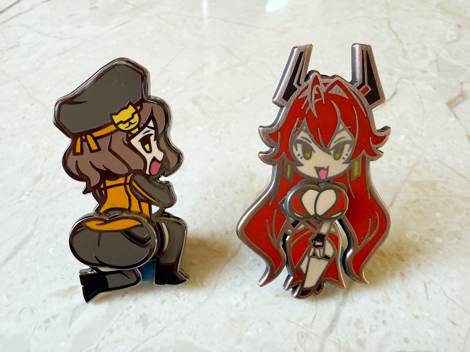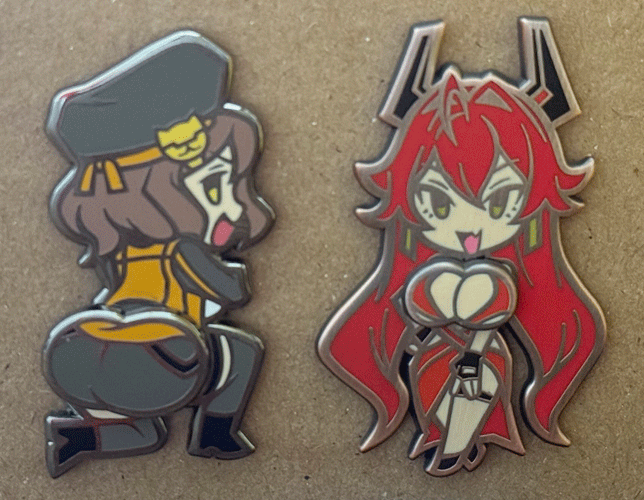 Metal enamel pin featuring Red Hood from NIKKE. Her assets are on a separate layer so you can see them move! Measures approximately 5 cm/2 in.